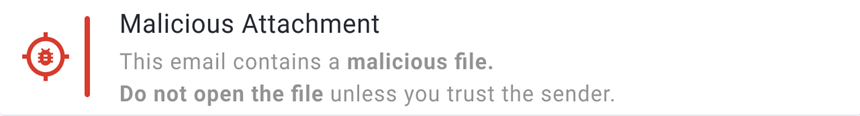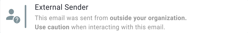 - Informative: (Gray icon) Datto SaaS Defense determines there is nothing suspicious or malicious about the email. However, the email was sent from outside the end user's organization and therefore, the end user should use caution when interacting with the email.