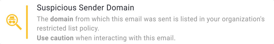 - Warning: (Yellow icon) Datto SaaS Defense determines one of the email's elements is listed in the organization's restricted list policy or determines the email is spam. The end user should use caution when interacting with the email.
