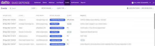 The Events page lists the records for which a client has determined an email was mishandled by Datto SaaS Defense. There are two situations where this may occur. In one situation, the client identifies an email as a security threat that should have been quarantined by Datto SaaS Defense, but it wasn't. In the other situation, an email was quarantined by Datto SaaS Defense but the client verifies it was not a threat. Therefore, the email should not have been quarantined.