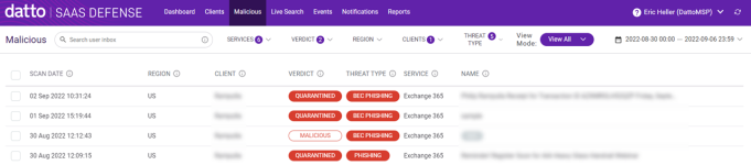 You can click a client's name to navigate to the Malicious page where the malicious and quarantined scans for only the selected client are listed.![]()