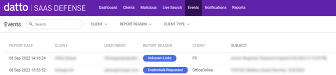 NOTE To learn more about the Datto SaaS Defense Report Threat add-in, see the article Deploying the Datto SaaS Defense Report Threat Add-In. For more information about the Email Threat Report, see the article Configuring the Email Threat Report.