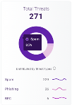 The Total Threats widget breaks down the total number of threats to show the number of threats for each threat type. Each number indicates the total number of threats that were prevented or detected. Data for malicious files, phishing, spoofing, and spam are included. Filter criteria you select applies to the data.