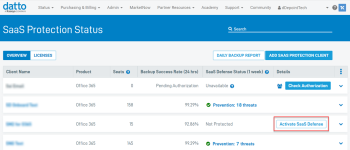 - On the SaaS Protection Status page, you can activate Datto SaaS Defense for a client when the value in the Details column for the client's record is Activate SaaS Defense. For the client desired, click Activate SaaS Defense.