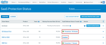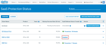 - You are redirected back to the SaaS Protection Status page. For the client's record, verify the value in the SaaS Defense Status column indicates Enabled.