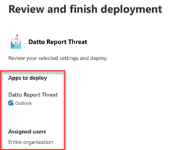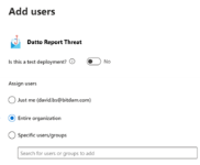 IMPORTANT Selecting Entire Organization will automatically deploy the Datto SaaS Defense Report Threat add-in to each new client's end users or current client's end users that are added in the future. Therefore, you won't need to perform the deployment steps again.