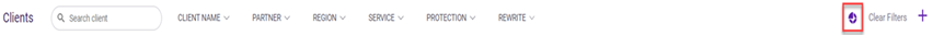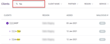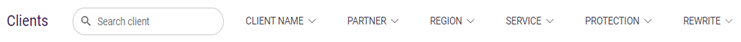 You can search for a specific client by entering the client's name in the search box, which is not case-sensitive. As you enter text in the search box, the page results begin to filter based on the Client field.