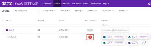 EXAMPLE In this Client page example, MSP-A has two clients, Client-A and Client-B. Looking at the Malicious # column for Client-A, you can see there were five scans that detected a malicious threat. The Services column shows the number of seats protected for each of Client-A's services (as in, 56 seats protected for Exchange 365, 51 seats protected for OneDrive, and so on).