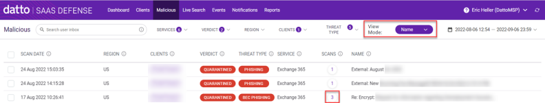 NOTE The number in the Malicious # column corresponds to the number of scan records that are accessible on the Malicious page for the applicable client. However, on the Malicious page, you can group scan records based on a common value, such as Name or Region (per View Mode. Doing so lists the grouped records together as one record. The Scans column lists the number of scan records within the grouped record. In this example, the Scans column shows that the third record includes three scans grouped together based on the Name value (as selected in View Mode). This most likely indicates the same threat was involved in each scan. You can click the grouped record to access each scan individually.