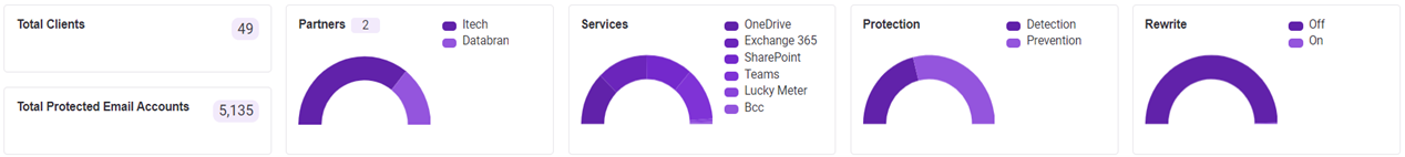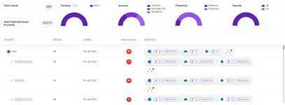 Services | The seat count for each of the Microsoft 365 services for each client. Each service tile provides access to the list of specific addresses/entities protected.. |