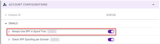 - For the Always Use SPF in Spoof Trial configuration, click the toggle in the Status column to enable it (button is on the right side in the Status column).