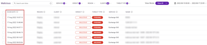 . The page displays only the records whose scan dates occurred within the range you selected. This example shows the results on the Malicious page.