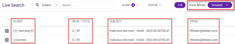 Selecting Grouped in View mode groups each email with matching Client, Subject, and From information into one record (one row). The Read/Total column indicates the number of emails in the group that have been accessed (Read) by the end user and the total number of emails included in the group. Grouping emails is a quick way to quarantine the emails included in the group all at once.
