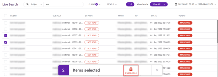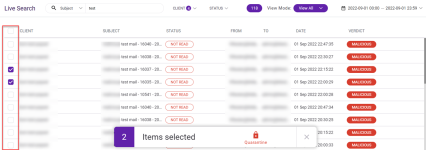 Each email record includes a checkbox in the first column that when selected, allows you to quarantine the email.![]()