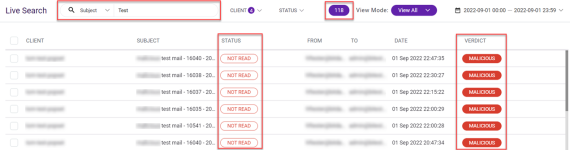 Therefore, for a client in prevention mode, an email whose Verdict equals Malicious can be investigated and released directly from the Live Search page. Consequently, an email whose Verdict equals Approved can be investigated and quarantined.