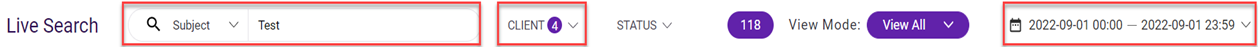 In this example, in the Choose clients field, 4 indicates that four clients were selected. The date selected for the search is 01 Sep 2022. Test is entered as the Subject field criteria.![]()